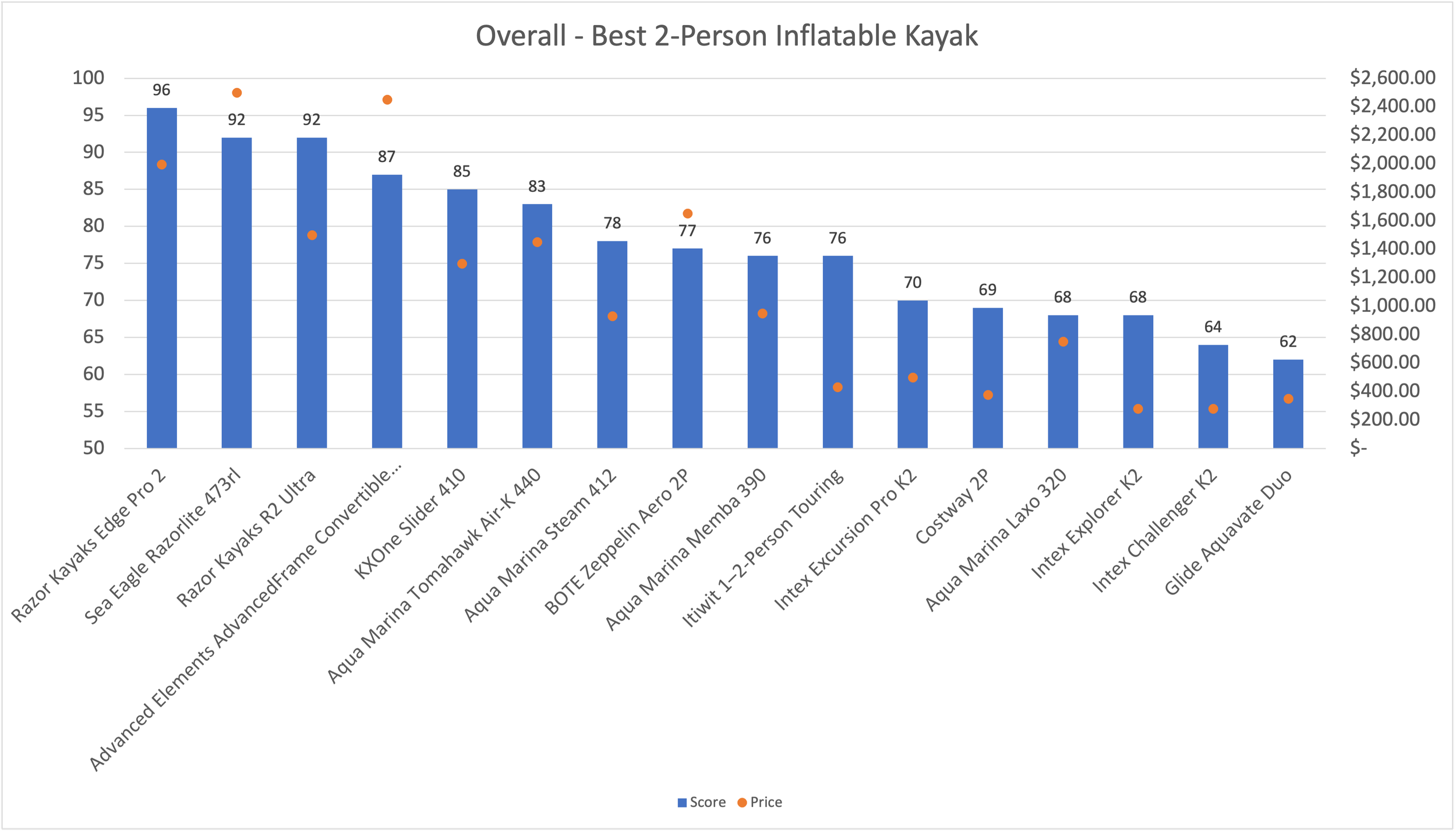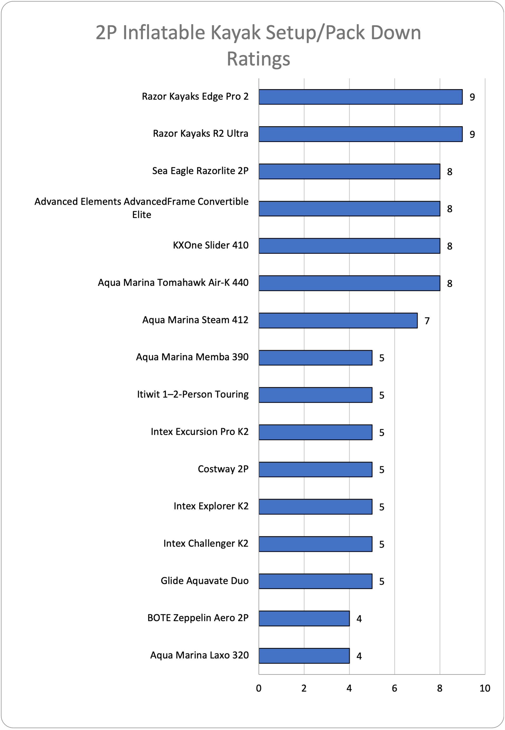 Each kayak is scored (typically out of 10) across five core categories, which feed into our overall rating: