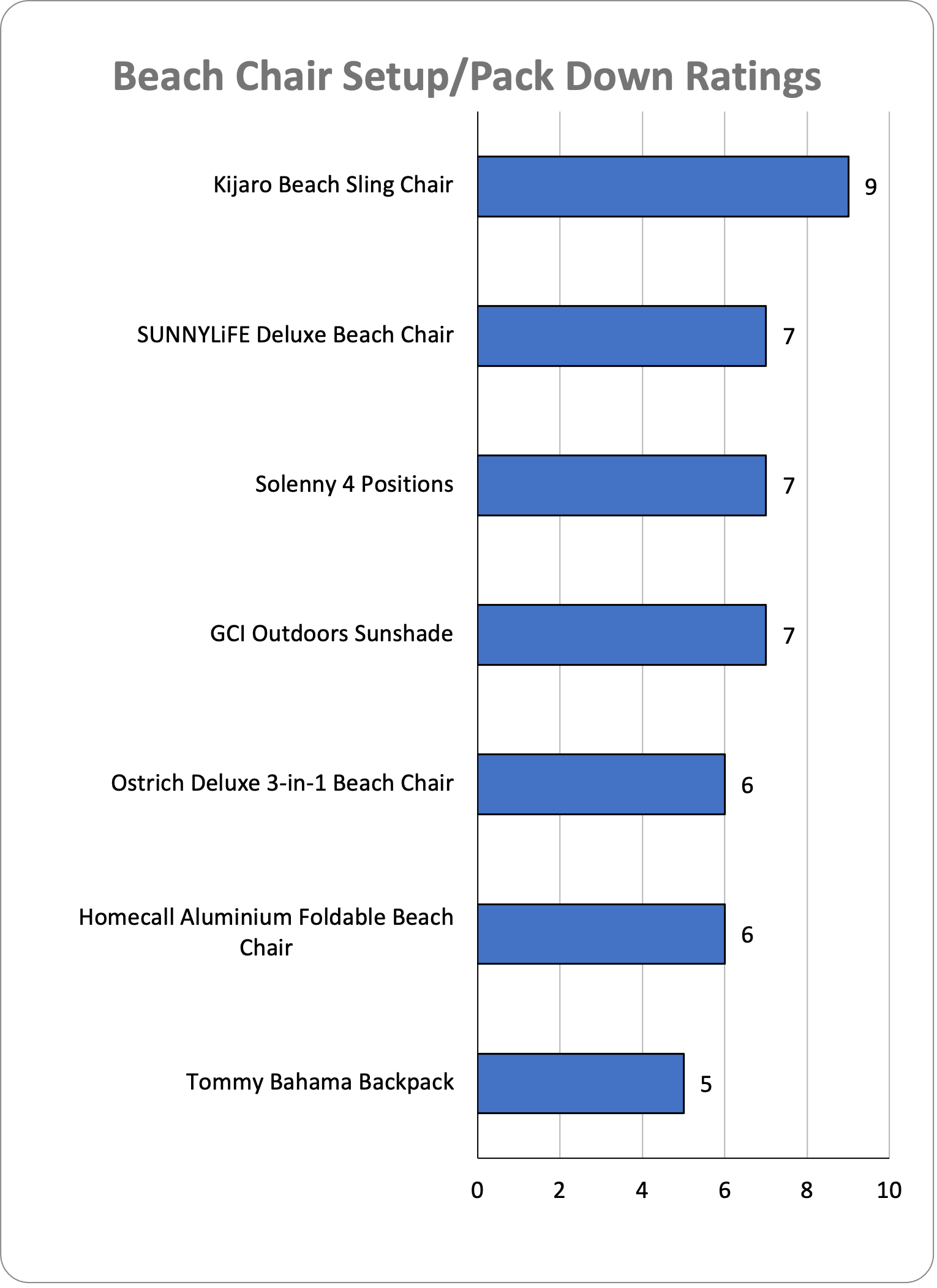 Setup/Pack Down evaluates how effortless it is to unfold and collapse your beach chair, as well as its dimensions when both fully open and packed away.