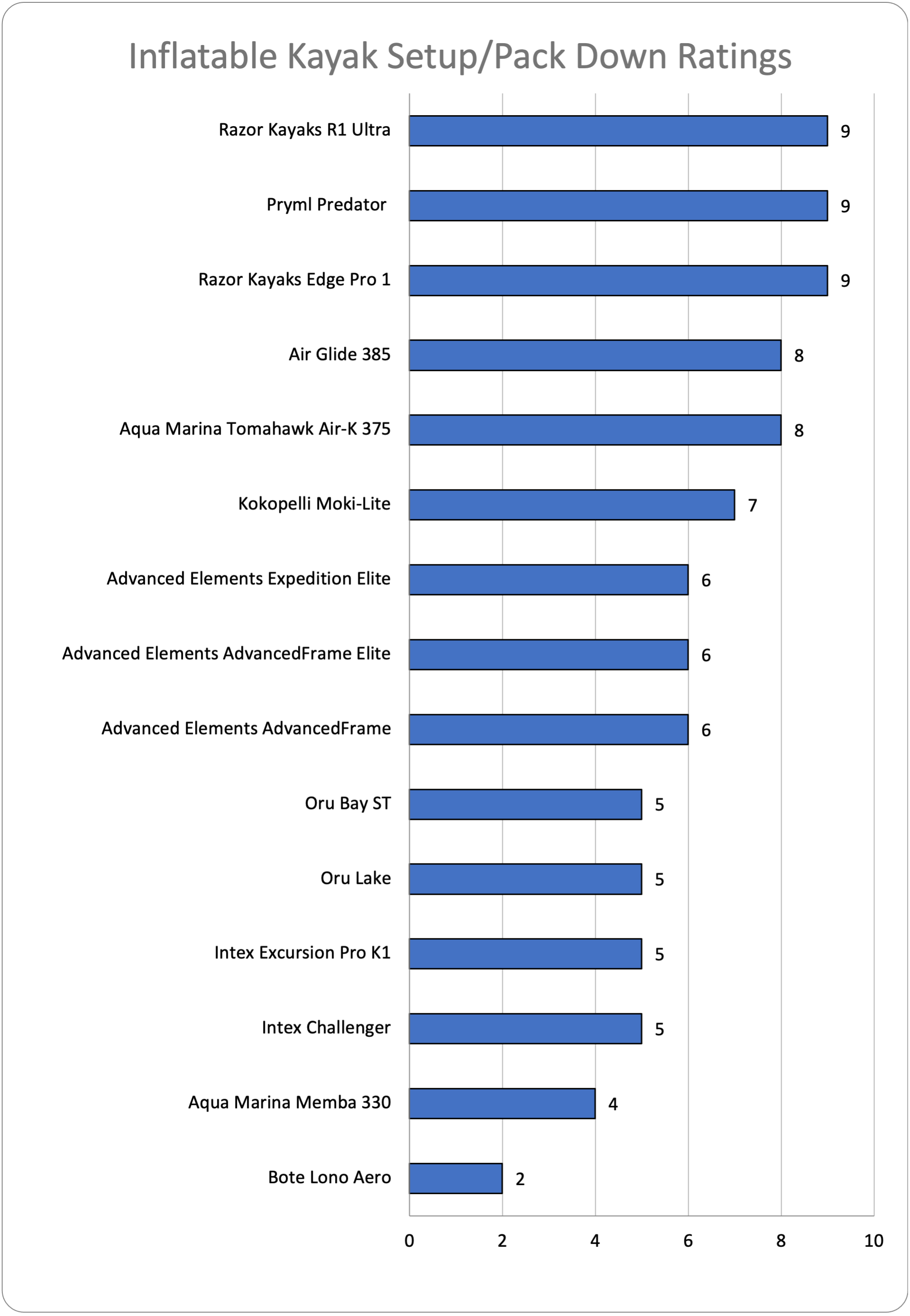 Setup and pack down looks at how quickly you can get on the water as well as how long it takes to get it back in the bag after you are done.
